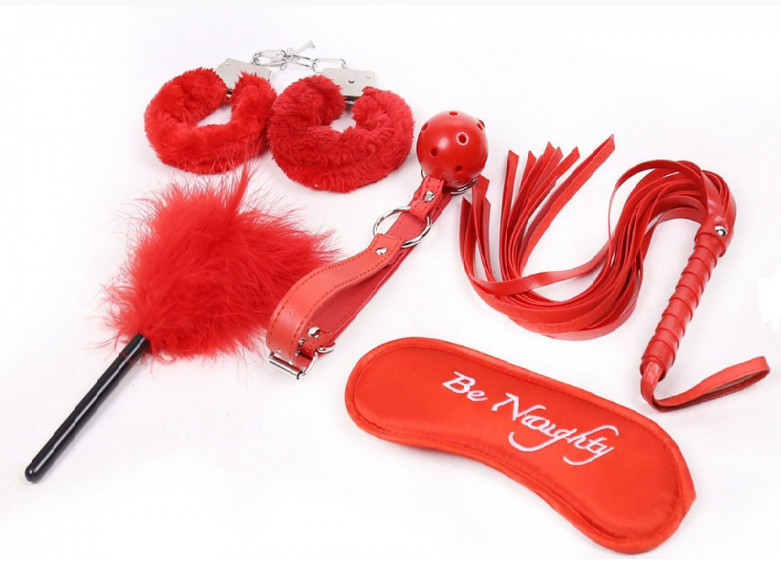 A szett tartalma: 1 db ciróka 1 db bilincs 1 db szájpecek 1 db korbács 1 db szemkötő |