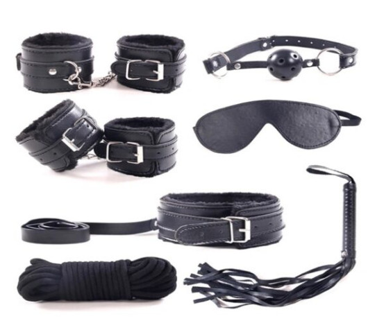A készlet tartalma: 1 pár csuklóbilincs 1 pár bokabilincs 1 db szemkötő 1 db szájpecek 1 db nyakörv+vezető szár 1 db kötöző 1 db korbács |